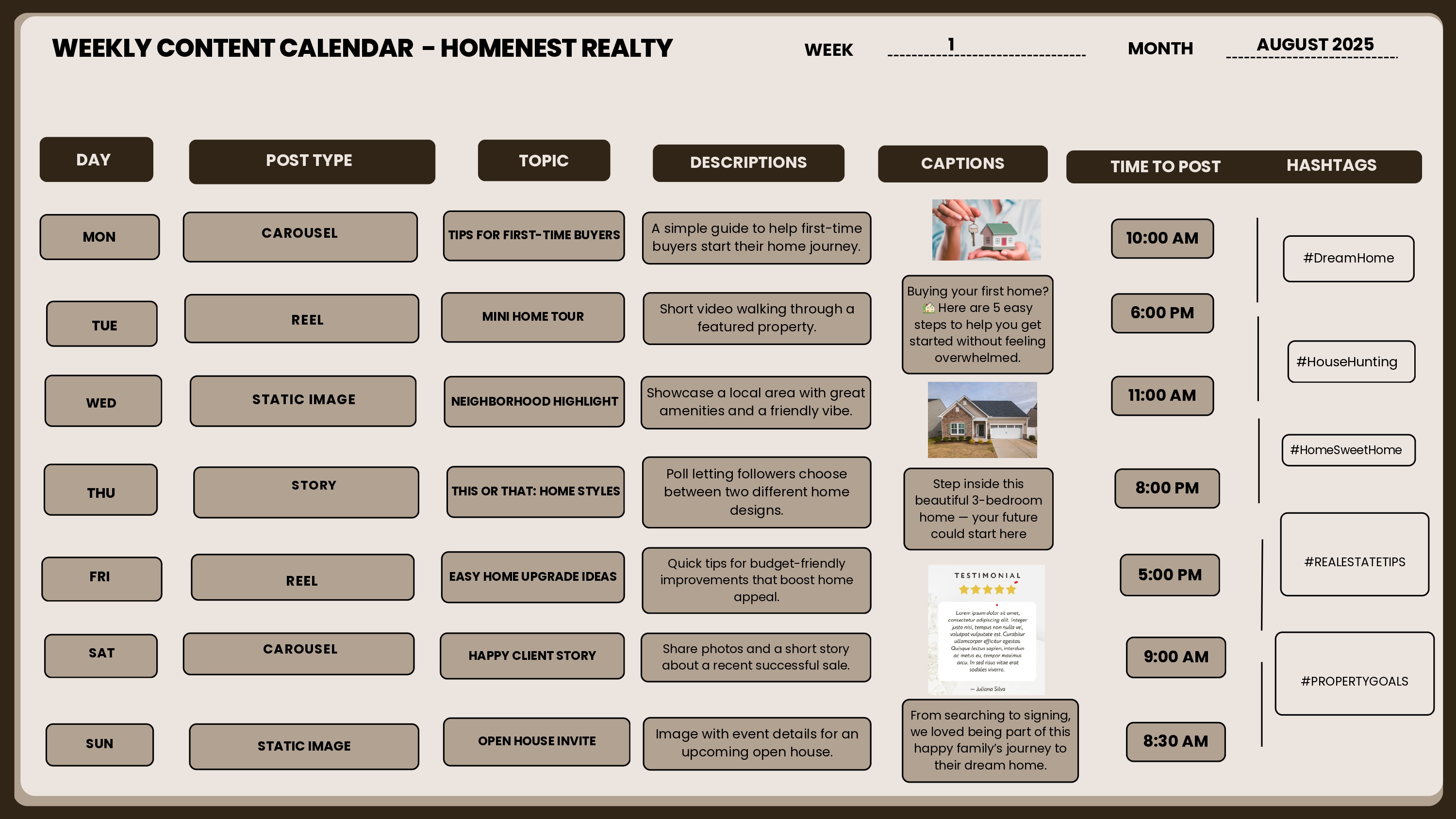 I create weekly content calendars that help businesses stay consistent and organized with their online presence. My calendars ensure that every post has a clear purpose, aligns with brand goals, and speaks to the right audience at the right time.