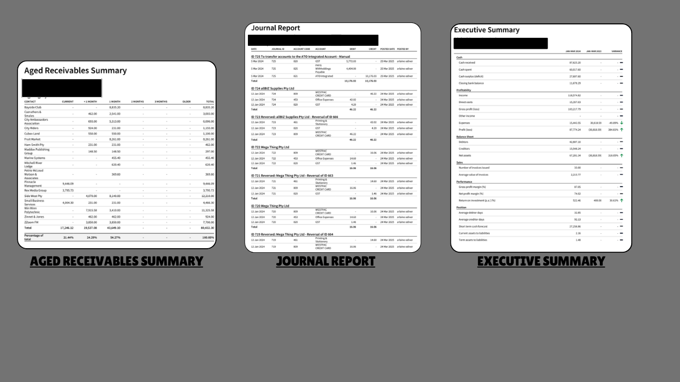 I generate clear and organized reports including Aged Receivables Summary, Journal Reports, and Executive Summaries to help you monitor financial performance and make informed decisions.