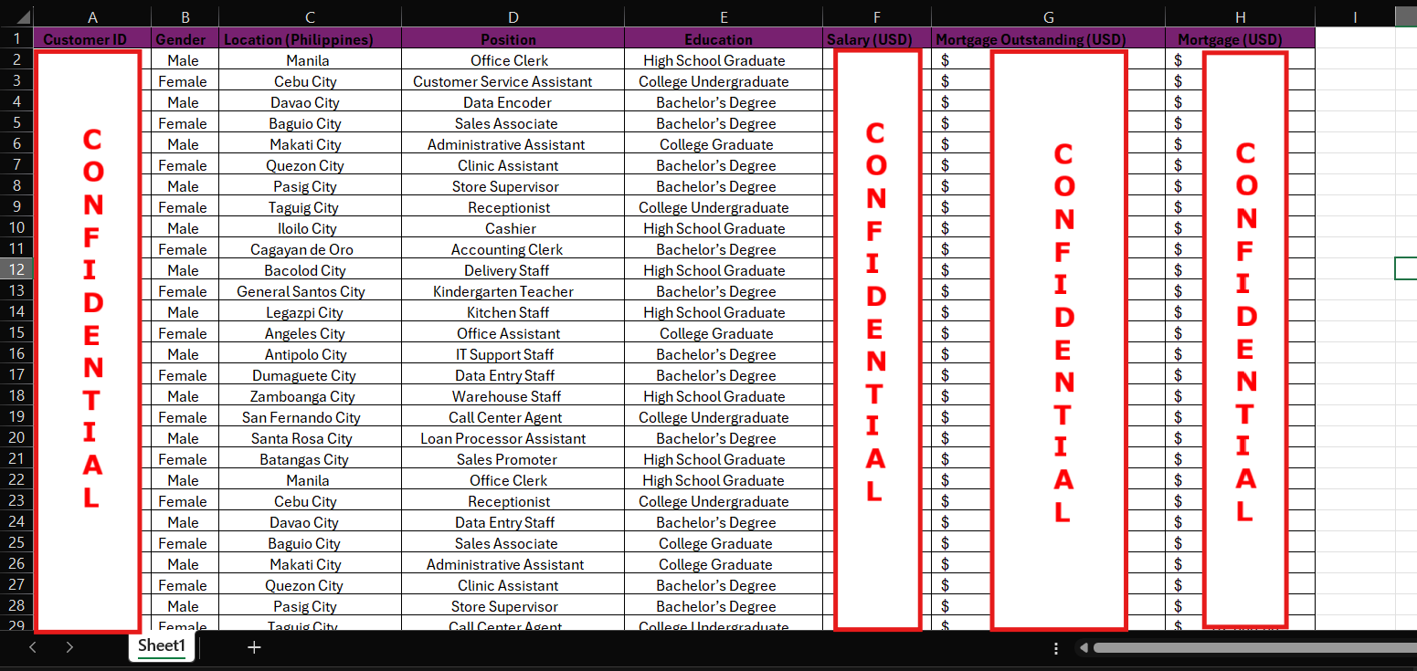 The dataset, created using Microsoft Excel, contains a curated list of individuals based in various cities across the Philippines, with details including customer ID, gender, location, position, education, salary, mortgage outstanding, and total mortgage amount. It captures a realistic snapshot of entry- to mid-level professionals—such as office clerks, receptionists, sales associates, and call center agents—along with their corresponding education levels and income.