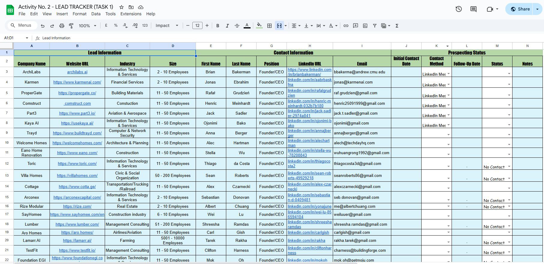 Built a lead tracker with 50+ contacts segmented by industry, company size, and contact method.