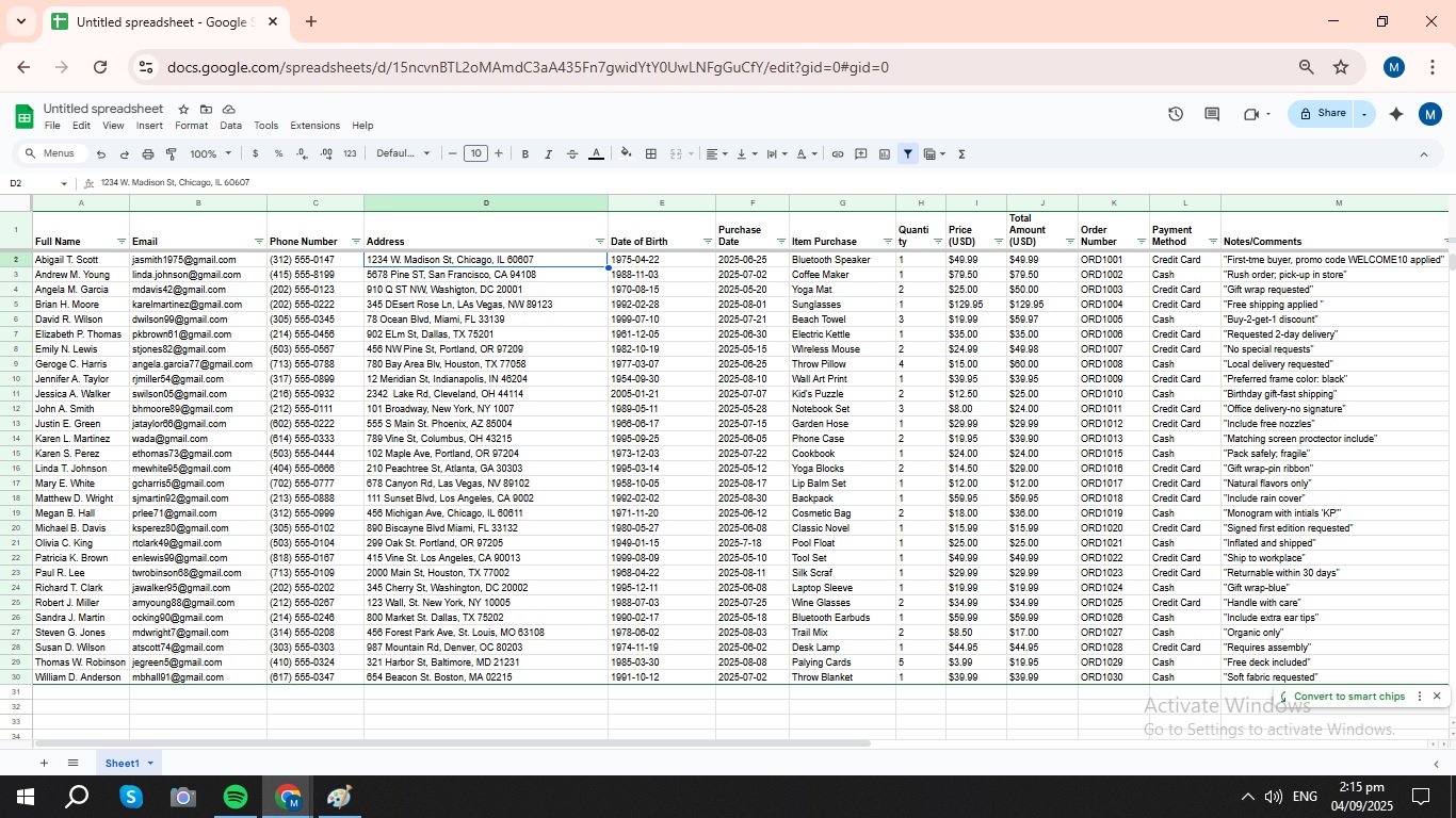 This sample project demonstrates my ability to organize and structure detailed customer and order data in a format commonly used in retail and e-commerce environments. The dataset simulates real-world transaction records from a variety of customers across the U.S., and includes full purchase details, payment methods, and personalized order notes.