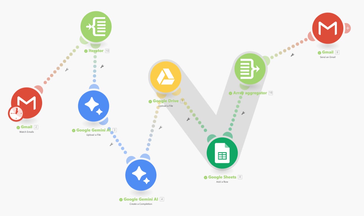 This workflow monitors Gmail for new emails, processes them with Gemini AI for content extraction and summarization, uploads relevant files to Google Drive, and stores key details in Google Sheets. Results are aggregated for reporting or notification, with final output sent via Gmail. The process streamlines email management, recordkeeping, and automated response generation for fast, minimal-effort data handling