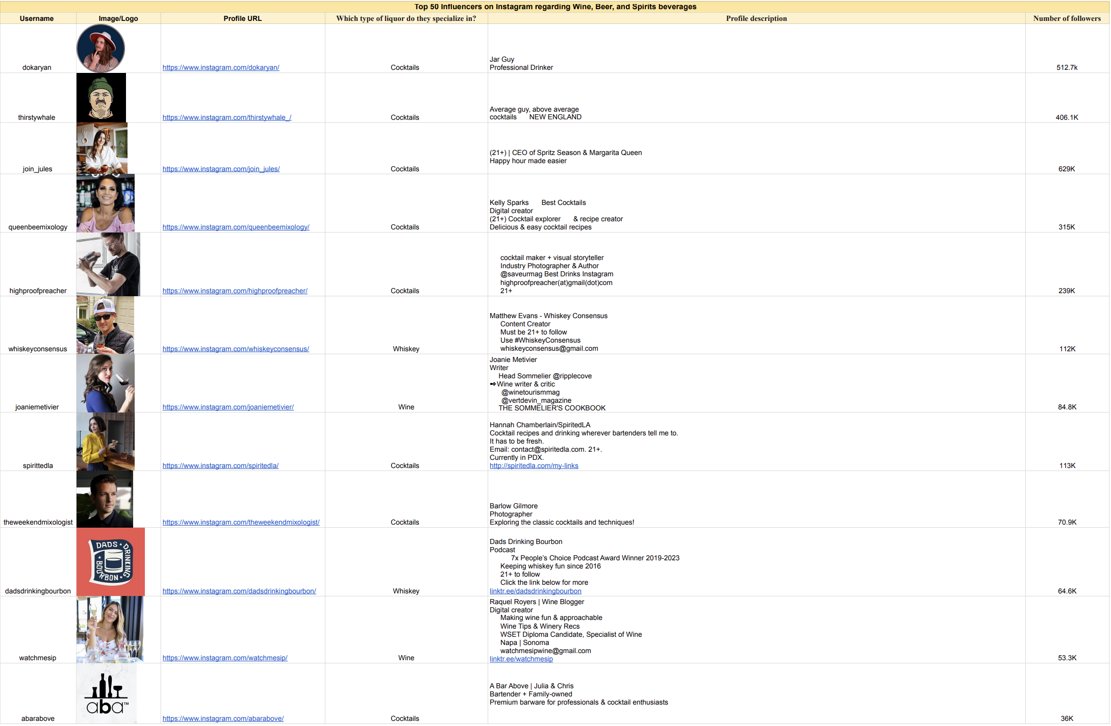 Top 50 Influencers on Instagram regarding Wine, Beer, and Spirits beverages